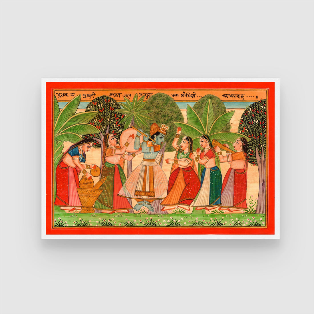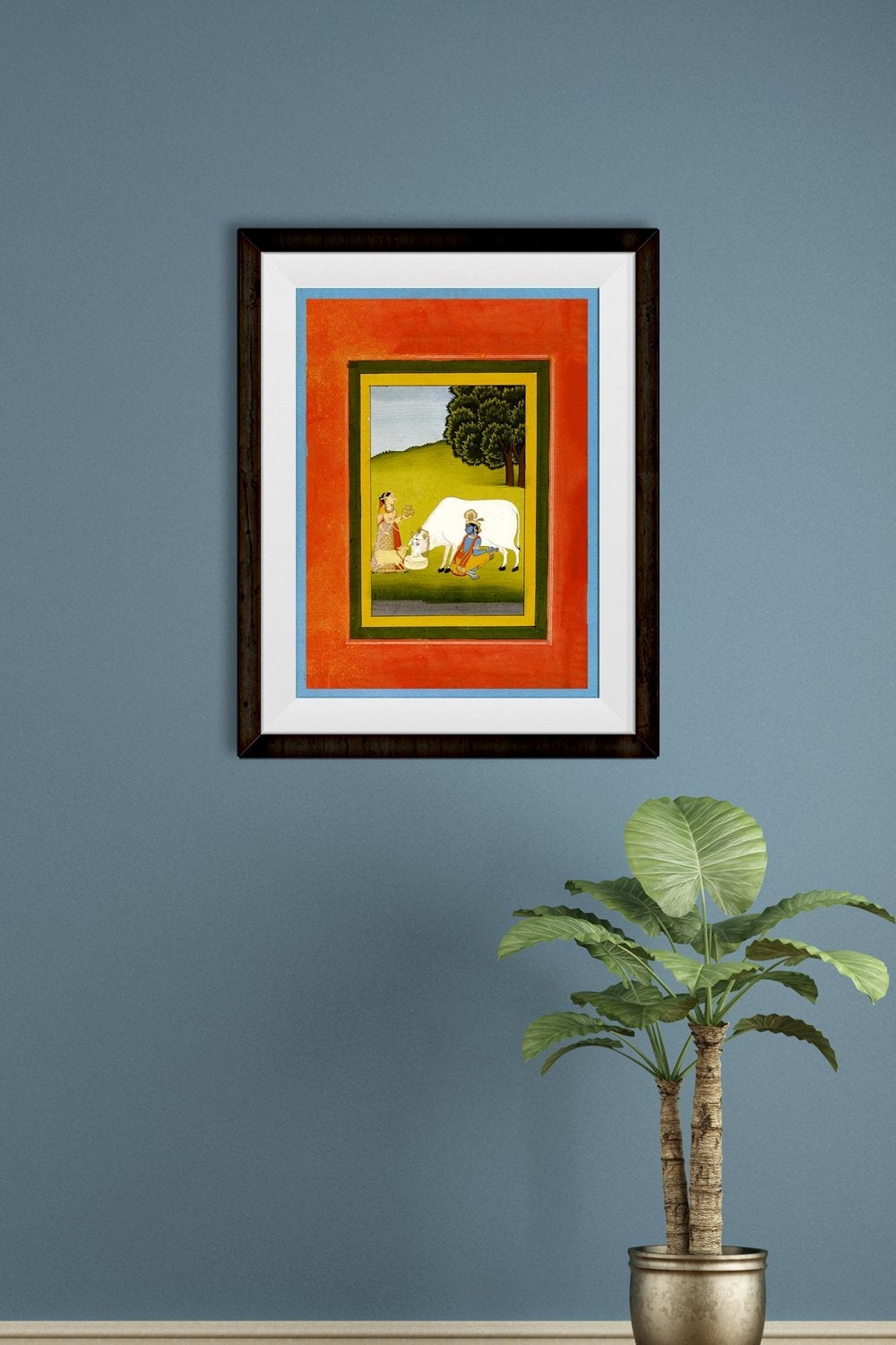 Krishna playing the flute to a dancing Radha, two holy cows Painting - Meri Deewar