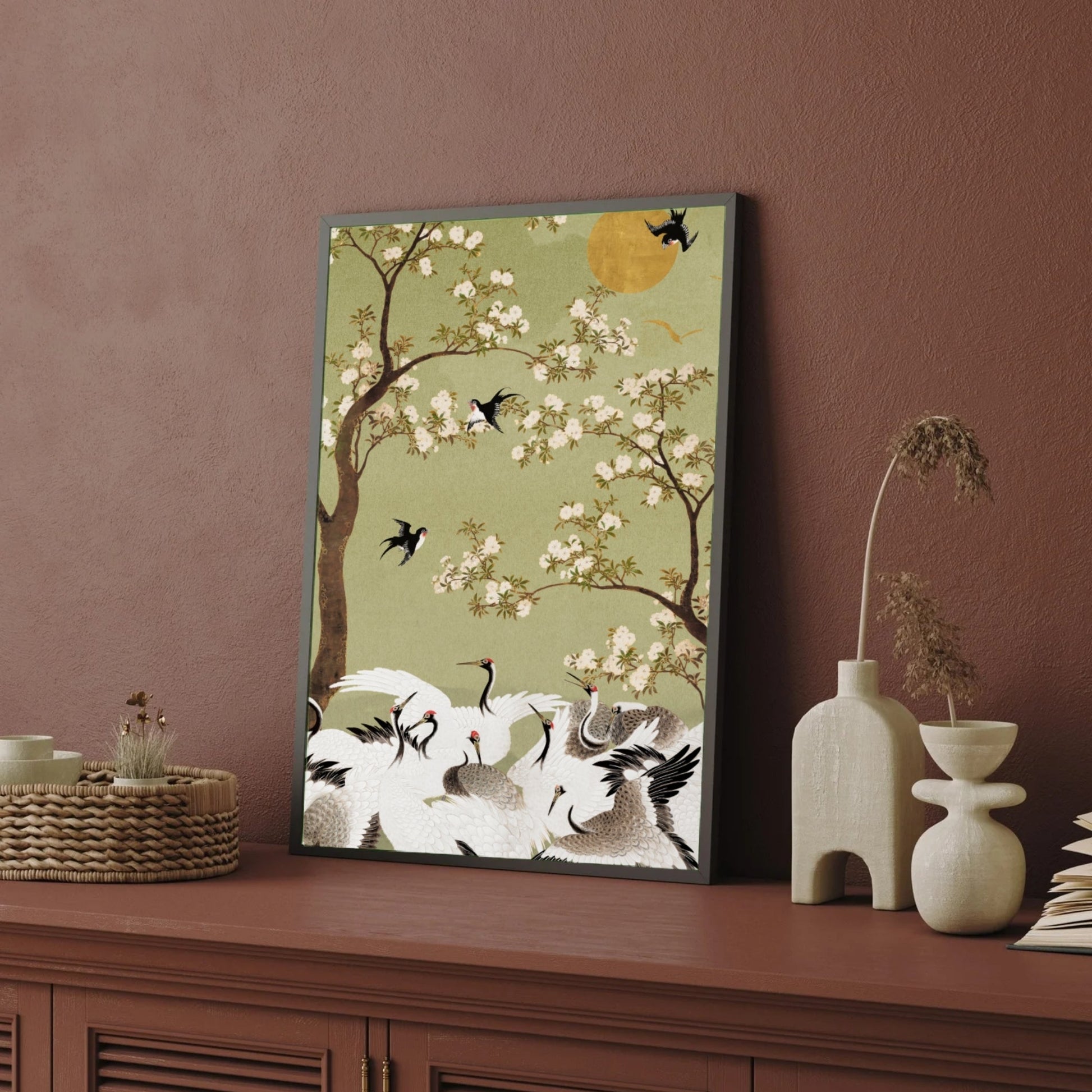 Make a grand statement with this large-format crane wall mural, inspired by classic oriental aesthetics. Printed using archival inks on premium canvas, the Cranes & Cherry Blossoms mural brings serene movement and delicate florals to expansive walls, entrances or hotel lobbies. Designed for scale, color accuracy and gallery presentation, it works brilliantly as a focal wall or as part of a curated interior scheme. For buyers seeking oriental wall art or crane murals, MeriDeewar offers museum-quality finishes and sizing options at merideewar.com