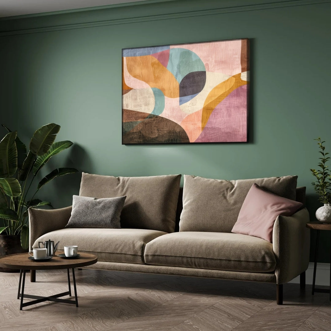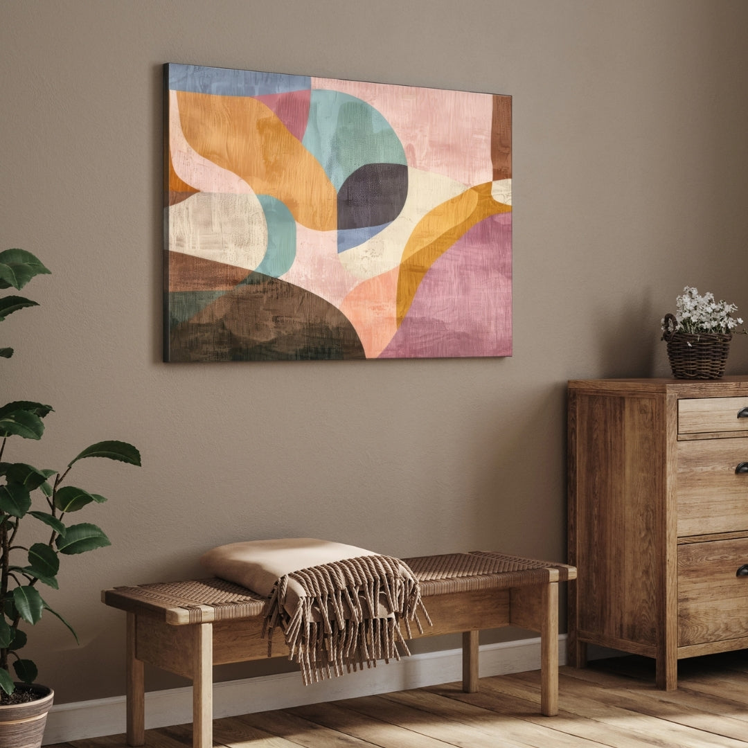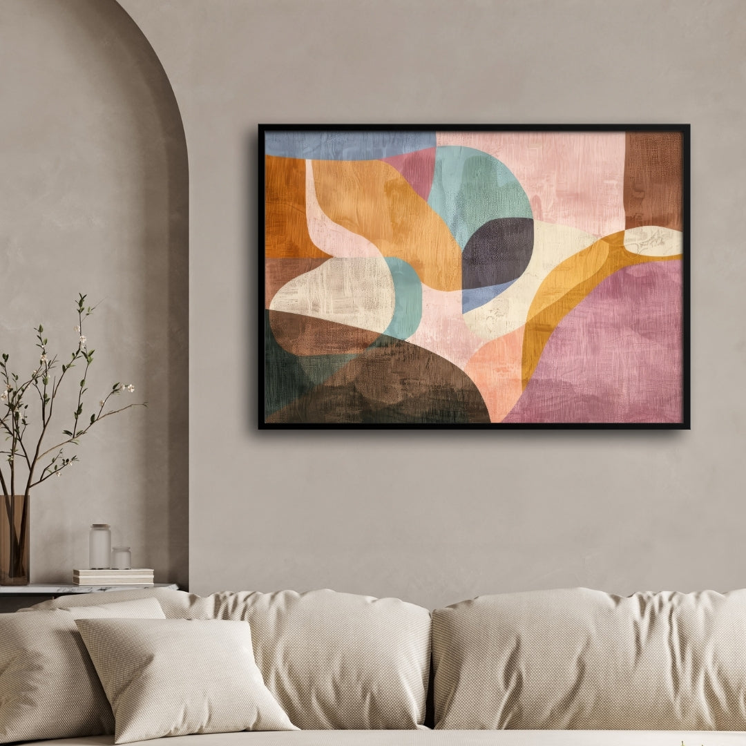 This artwork features layers of soft pink, golden ochre, teal, and ivory, blending seamlessly into one another like a sunset in motion. The geometric curves and painterly textures create a soothing sense of depth — perfect for modern, bohemian, and mid-century inspired interiors.