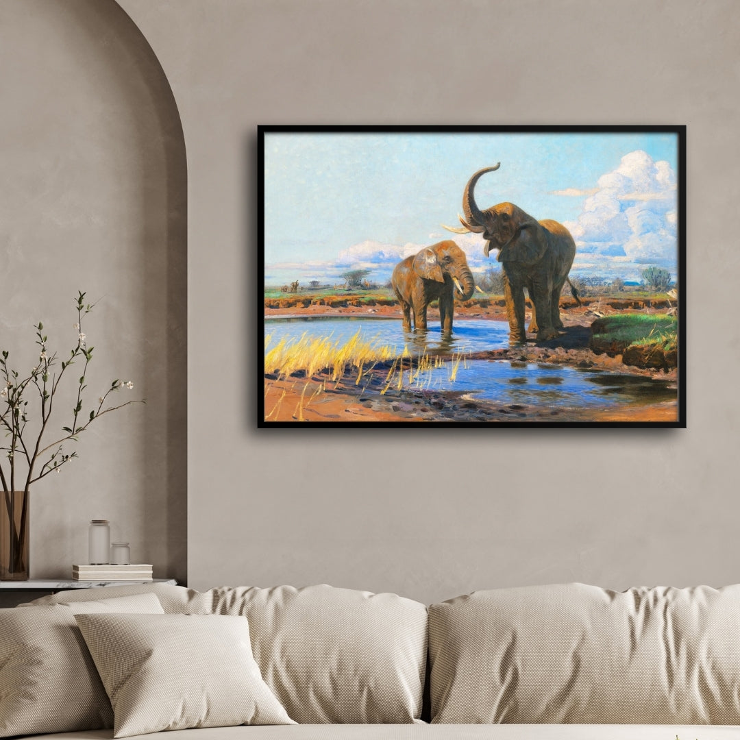 Every detail—from the rippling water to the textured brushstrokes of the elephants' skin—brings nature’s grandeur right to your wall. Perfect for living rooms, offices, or any space where bold, nature-inspired elegance belongs.