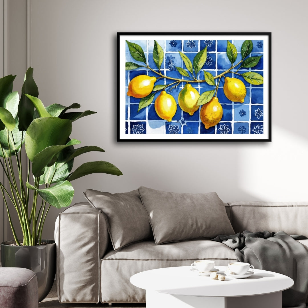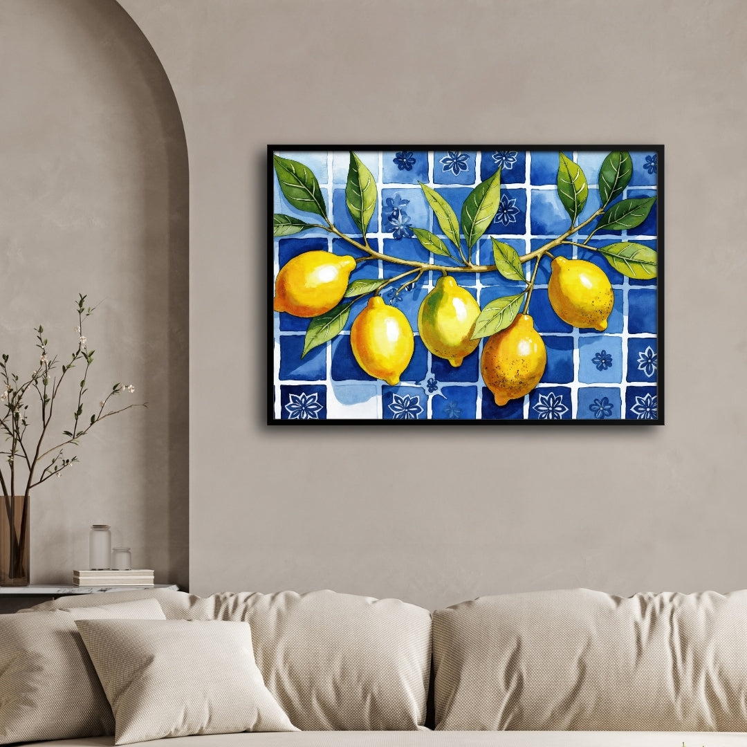 Bring freshness and vibrancy to your walls with Mediterranean Lemons, a contemporary canvas print featuring ripe yellow lemons against a stunning blue tile backdrop. Inspired by Mediterranean kitchens and Italian ceramic patterns, this art piece adds warmth, brightness, and a touch of rustic elegance to your home décor.